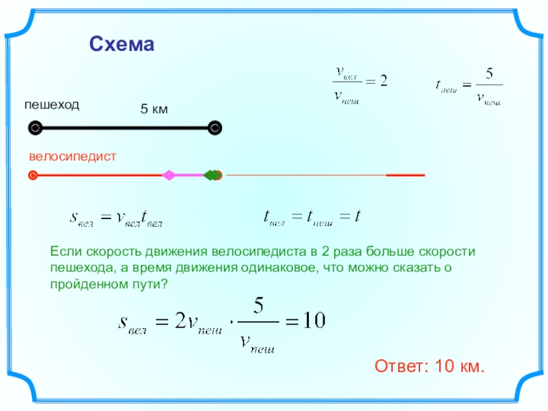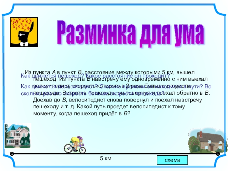 Как движется велосипедист? Сколько времени он находится в пути? Во сколько раз его скорость больше скорости пешехода?