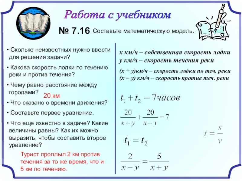 (х – у) км/ч – скорость против теч. реки