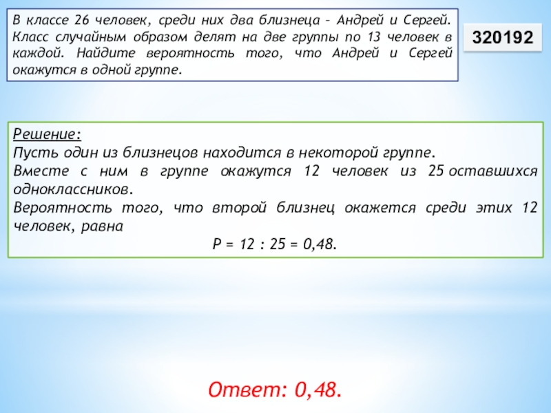 В классе 26 человек, среди них два близнеца – Андрей и Сергей. Класс случайным образом делят на две группы по 13 человек в каждой. Найдите вероятность того, что Андрей и Сергей окажутся в одной группе.