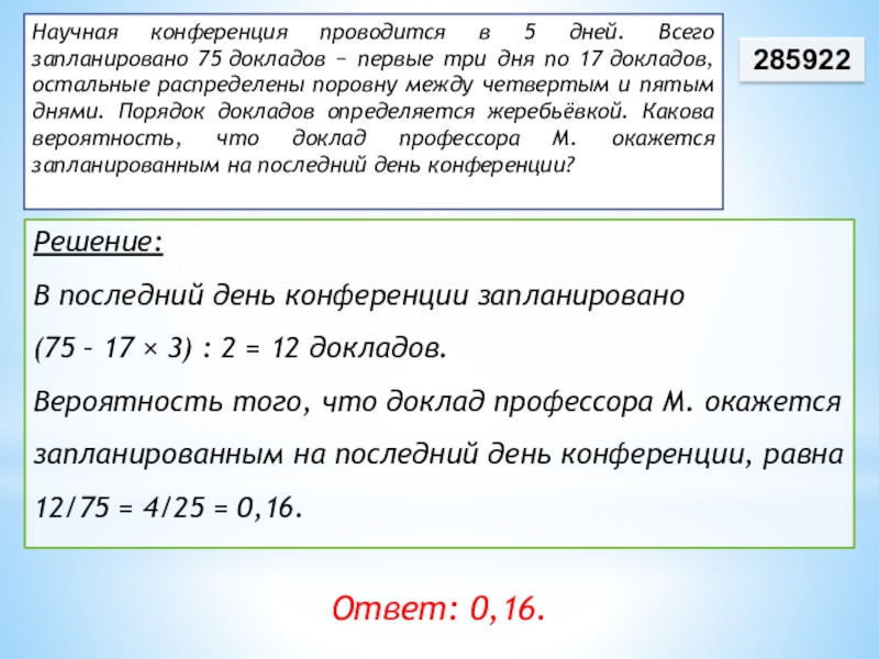 Вероятность того, что доклад профессора М. окажется запланированным на последний день конференции, равна 12/75 = 4/25 = 0,16.