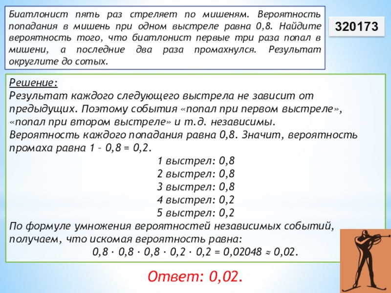 Биатлонист пять раз стреляет по мишеням. Вероятность попадания в мишень при одном выстреле равна 0,8. Найдите вероятность того, что биатлонист первые три раза попал в мишени, а последние два раза промахнулся. Результат округлите до сотых.