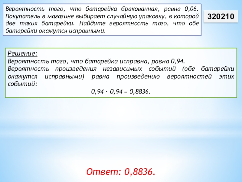 Вероятность того, что батарейка бракованная, равна 0,06. Покупатель в магазине выбирает случайную упаковку, в которой две таких батарейки. Найдите вероятность того, что обе батарейки окажутся исправными.