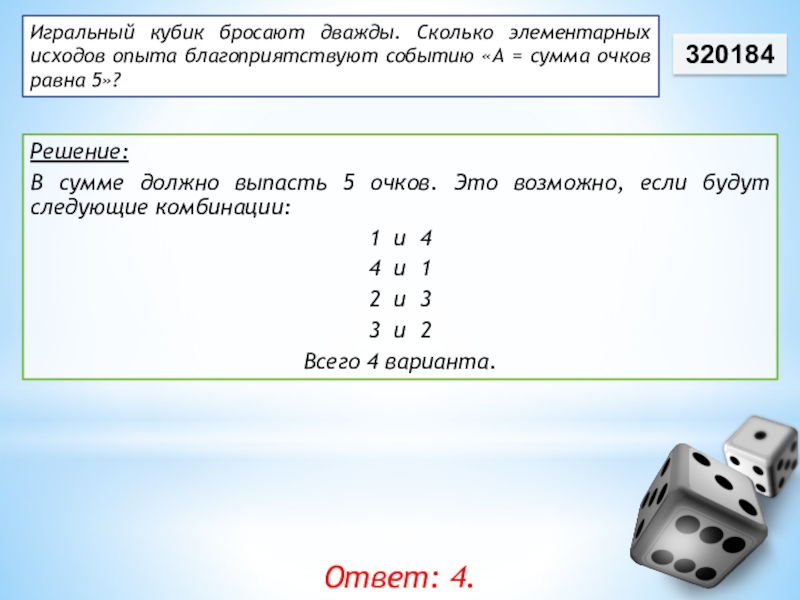 Игральный кубик бросают дважды. Сколько элементарных исходов опыта благоприятствуют событию «А = сумма очков равна 5»?
