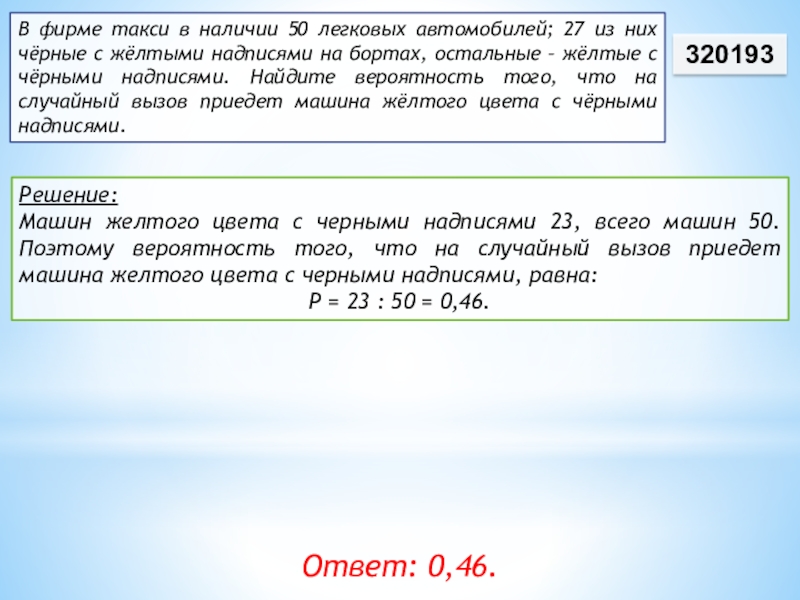 В фирме такси в наличии 50 легковых автомобилей; 27 из них чёрные с жёлтыми надписями на бортах, остальные – жёлтые с чёрными надписями. Найдите вероятность того, что на случайный вызов приедет машина жёлтого цвета с чёрными надписями.