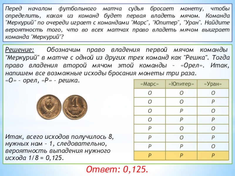 Перед началом футбольного матча судья бросает монету, чтобы определить, какая из команд будет первая владеть мячом. Команда "Меркурий" по очереди играет с командами "Марс", "Юпитер", "Уран". Найдите вероятность того, что во всех матчах право владеть мячом выиграет команда "Меркурий"?