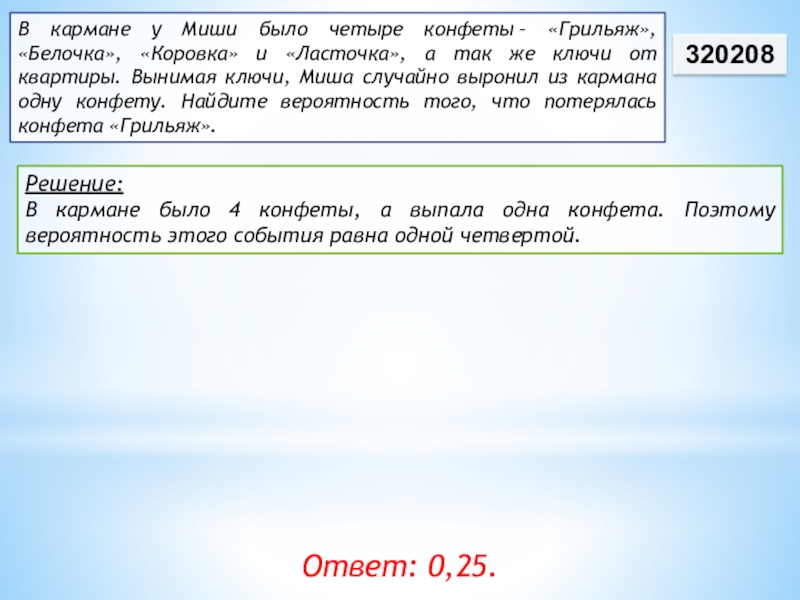 В кармане у Миши было четыре конфеты – «Грильяж», «Белочка», «Коровка» и «Ласточка», а так же ключи от квартиры. Вынимая ключи, Миша случайно выронил из кармана одну конфету. Найдите вероятность того, что потерялась конфета «Грильяж».