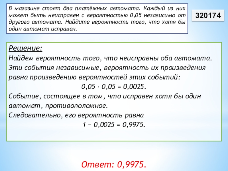 В магазине стоят два платёжных автомата. Каждый из них может быть неисправен с вероятностью 0,05 независимо от другого автомата. Найдите вероятность того, что хотя бы один автомат исправен.