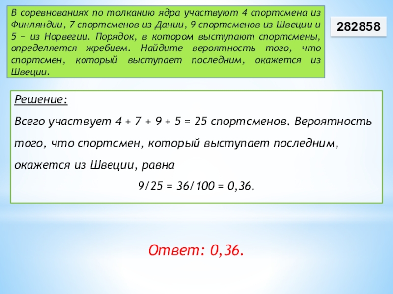 Всего участвует 4 + 7 + 9 + 5 = 25 спортсменов. Вероятность того, что спортсмен, который выступает последним, окажется из Швеции, равна