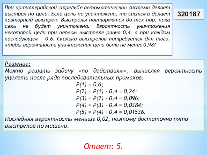 При артиллерийской стрельбе автоматическая система делает выстрел по цели. Если цель не уничтожена, то система делает повторный выстрел. Выстрелы повторяются до тех пор, пока цель не будет уничтожена. Вероятность уничтожения некоторой цели при первом выстреле равна 0,4, а при каждом последующем – 0,6. Сколько выстрелов потребуется для того, чтобы вероятность уничтожения цели была не менее 0,98?