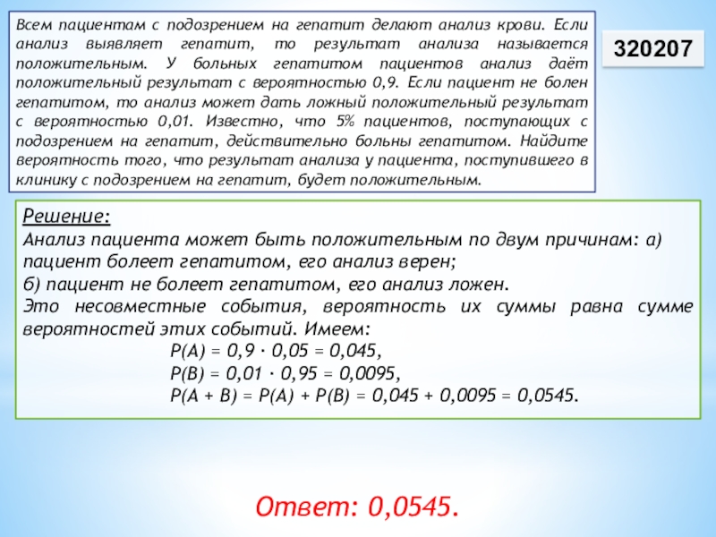 Всем пациентам с подозрением на гепатит делают анализ крови. Если анализ выявляет гепатит, то результат анализа называется положительным. У больных гепатитом пациентов анализ даёт положительный результат с вероятностью 0,9. Если пациент не болен гепатитом, то анализ может дать ложный положительный результат с вероятностью 0,01. Известно, что 5% пациентов, поступающих с подозрением на гепатит, действительно больны гепатитом. Найдите вероятность того, что результат анализа у пациента, поступившего в клинику с подозрением на гепатит, будет положительным.