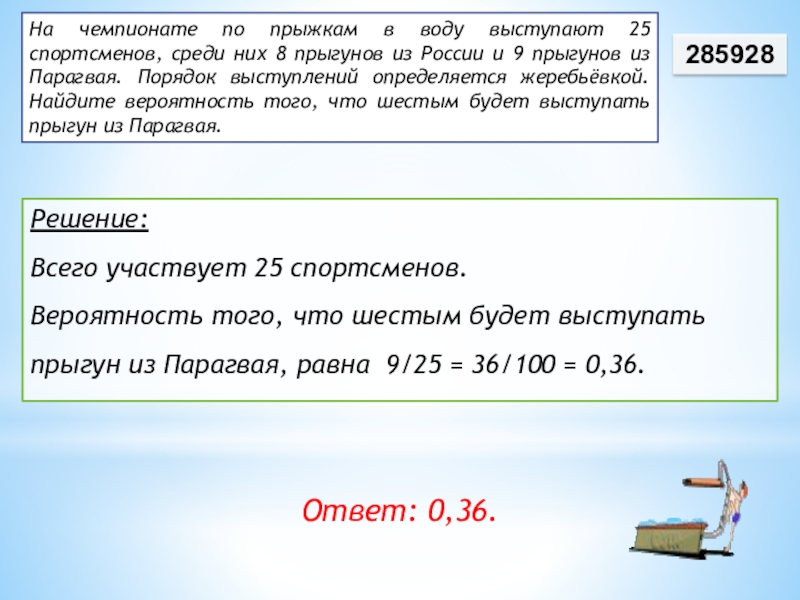 Вероятность того, что шестым будет выступать прыгун из Парагвая, равна 9/25 = 36/100 = 0,36.