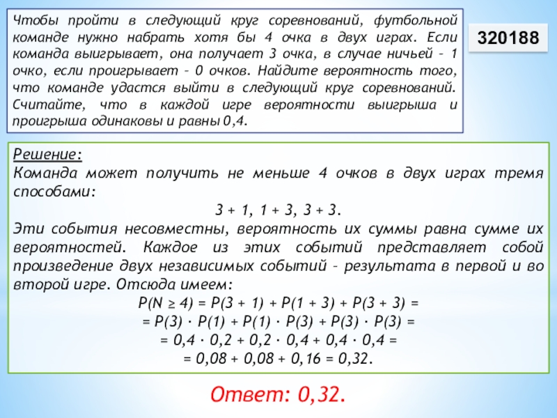 Чтобы пройти в следующий круг соревнований, футбольной команде нужно набрать хотя бы 4 очка в двух играх. Если команда выигрывает, она получает 3 очка, в случае ничьей – 1 очко, если проигрывает – 0 очков. Найдите вероятность того, что команде удастся выйти в следующий круг соревнований. Считайте, что в каждой игре вероятности выигрыша и проигрыша одинаковы и равны 0,4.