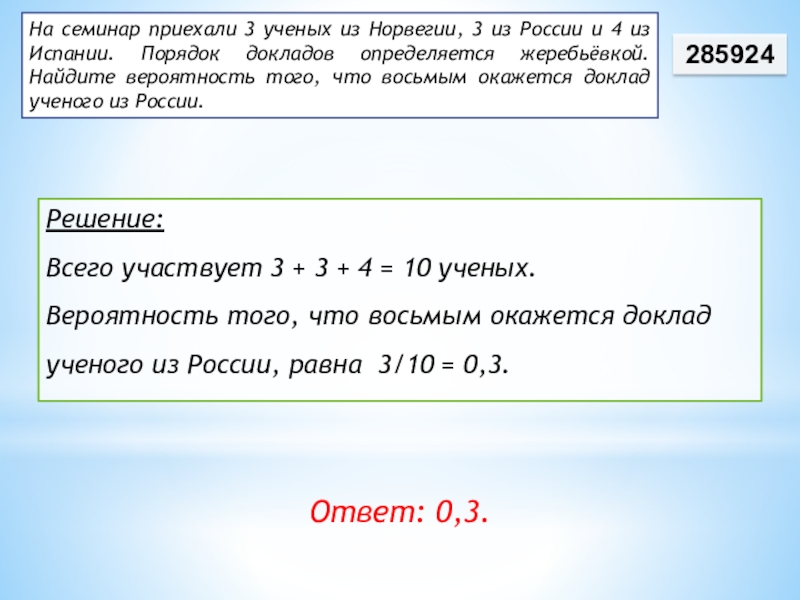 Вероятность того, что восьмым окажется доклад ученого из России, равна 3/10 = 0,3.
