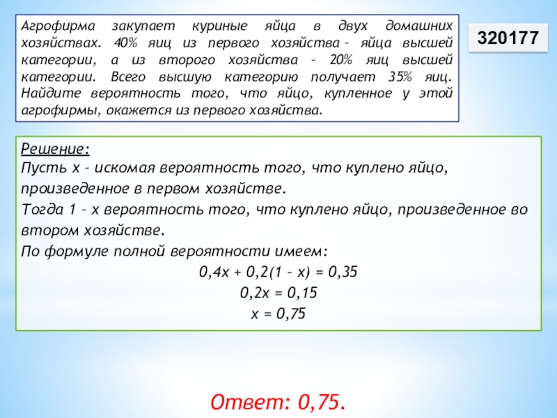 Агрофирма закупает куриные яйца в двух домашних хозяйствах. 40% яиц из первого хозяйства – яйца высшей категории, а из второго хозяйства – 20% яиц высшей категории. Всего высшую категорию получает 35% яиц. Найдите вероятность того, что яйцо, купленное у этой агрофирмы, окажется из первого хозяйства.