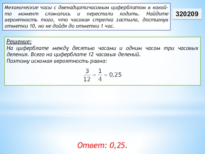 Механические часы с двенадцатичасовым циферблатом в какой-то момент сломались и перестали ходить. Найдите вероятность того, что часовая стрелка застыла, достигнув отметки 10, но не дойдя до отметки 1 час.