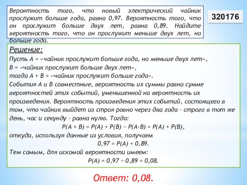 Вероятность того, что новый электрический чайник прослужит больше года, равна 0,97. Вероятность того, что он прослужит больше двух лет, равна 0,89. Найдите вероятность того, что он прослужит меньше двух лет, но больше года.