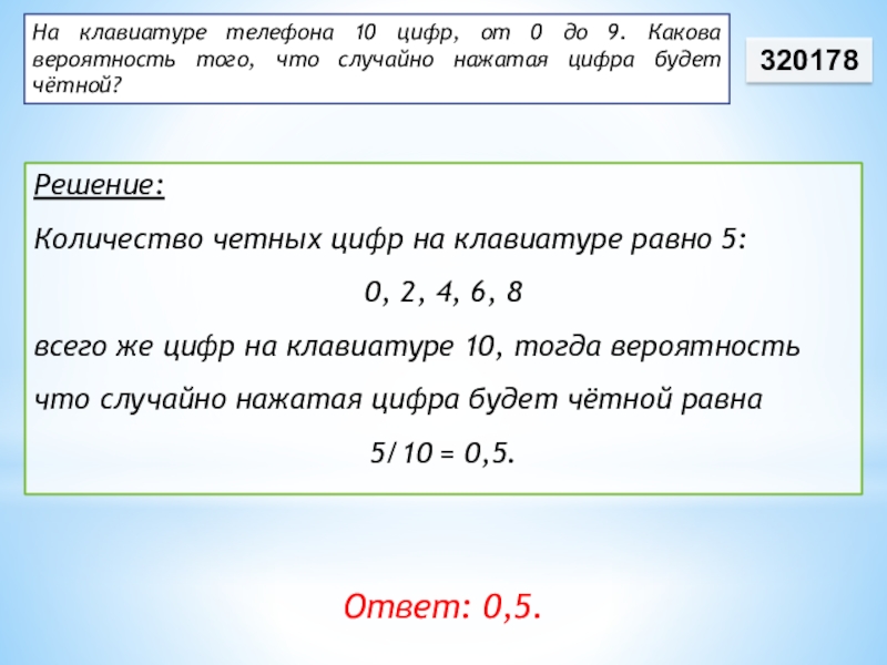 всего же цифр на клавиатуре 10, тогда вероятность что случайно нажатая цифра будет чётной равна