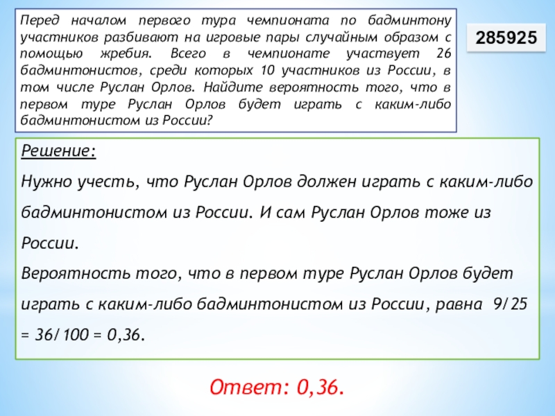 Вероятность того, что в первом туре Руслан Орлов будет играть с каким-либо бадминтонистом из России, равна 9/25 = 36/100 = 0,36.