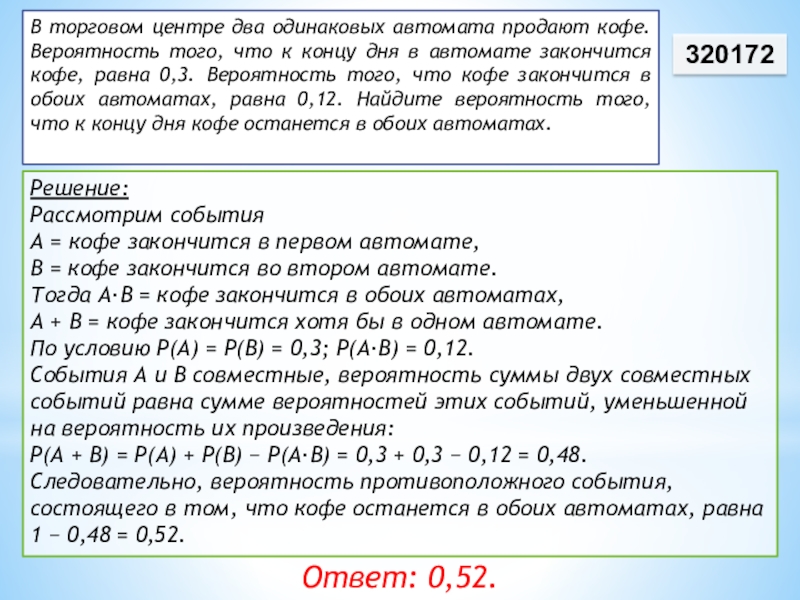 В торговом центре два одинаковых автомата продают кофе. Вероятность того, что к концу дня в автомате закончится кофе, равна 0,3. Вероятность того, что кофе закончится в обоих автоматах, равна 0,12. Найдите вероятность того, что к концу дня кофе останется в обоих автоматах.