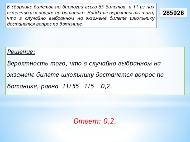 Вероятность того, что в случайно выбранном на экзамене билете школьнику достанется вопрос по ботанике, равна 11/55 =1/5 = 0,2.