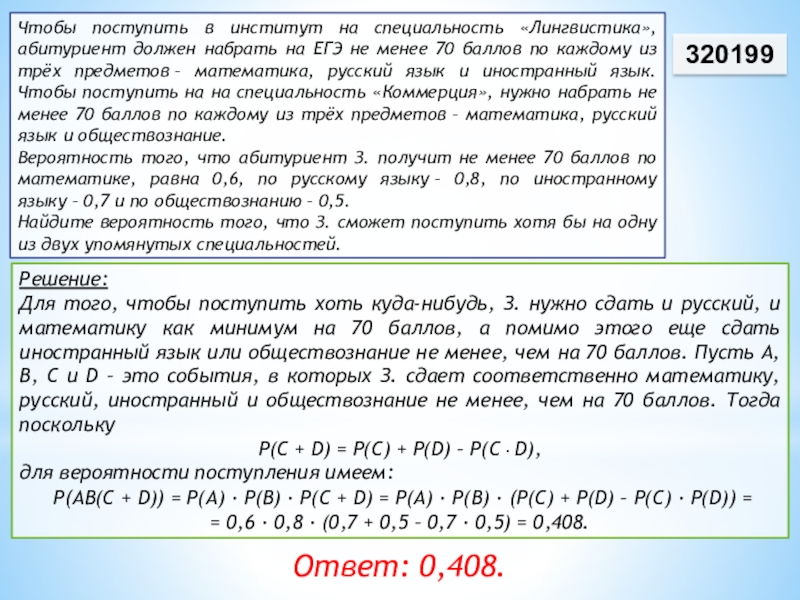 Чтобы поступить в институт на специальность «Лингвистика», абитуриент должен набрать на ЕГЭ не менее 70 баллов по каждому из трёх предметов – математика, русский язык и иностранный язык. Чтобы поступить на на специальность «Коммерция», нужно набрать не менее 70 баллов по каждому из трёх предметов – математика, русский язык и обществознание.