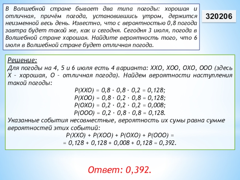 В Волшебной стране бывает два типа погоды: хорошая и отличная, причём погода, установившись утром, держится неизменной весь день. Известно, что с вероятностью 0,8 погода завтра будет такой же, как и сегодня. Сегодня 3 июля, погода в Волшебной стране хорошая. Найдите вероятность того, что 6 июля в Волшебной стране будет отличная погода.