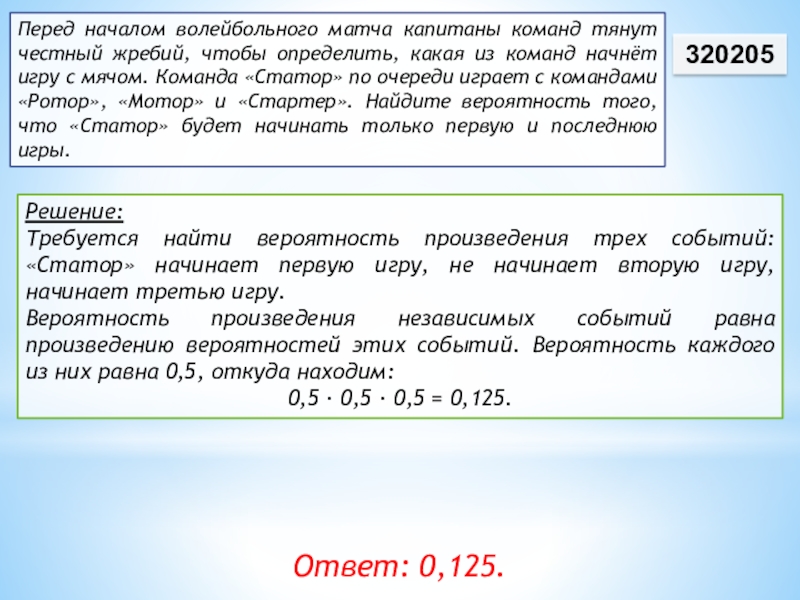 Перед началом волейбольного матча капитаны команд тянут честный жребий, чтобы определить, какая из команд начнёт игру с мячом. Команда «Статор» по очереди играет с командами «Ротор», «Мотор» и «Стартер». Найдите вероятность того, что «Статор» будет начинать только первую и последнюю игры.