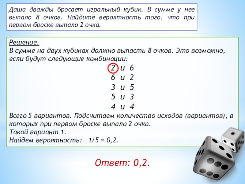 Даша дважды бросает игральный кубик. В сумме у нее выпало 8 очков. Найдите вероятность того, что при первом броске выпало 2 очка.