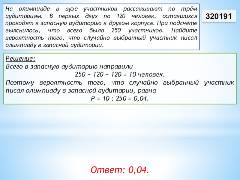 На олимпиаде в вузе участников рассаживают по трём аудиториям. В первых двух по 120 человек, оставшихся проводят в запасную аудиторию в другом корпусе. При подсчёте выяснилось, что всего было 250 участников. Найдите вероятность того, что случайно выбранный участник писал олимпиаду в запасной аудитории.