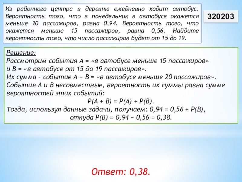Из районного центра в деревню ежедневно ходит автобус. Вероятность того, что в понедельник в автобусе окажется меньше 20 пассажиров, равна 0,94. Вероятность того, что окажется меньше 15 пассажиров, равна 0,56. Найдите вероятность того, что число пассажиров будет от 15 до 19.