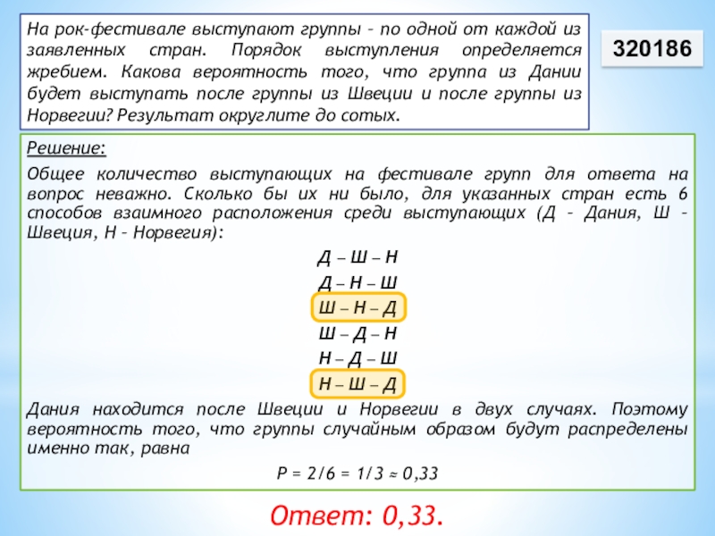 На рок-фестивале выступают группы – по одной от каждой из заявленных стран. Порядок выступления определяется жребием. Какова вероятность того, что группа из Дании будет выступать после группы из Швеции и после группы из Норвегии? Результат округлите до сотых.