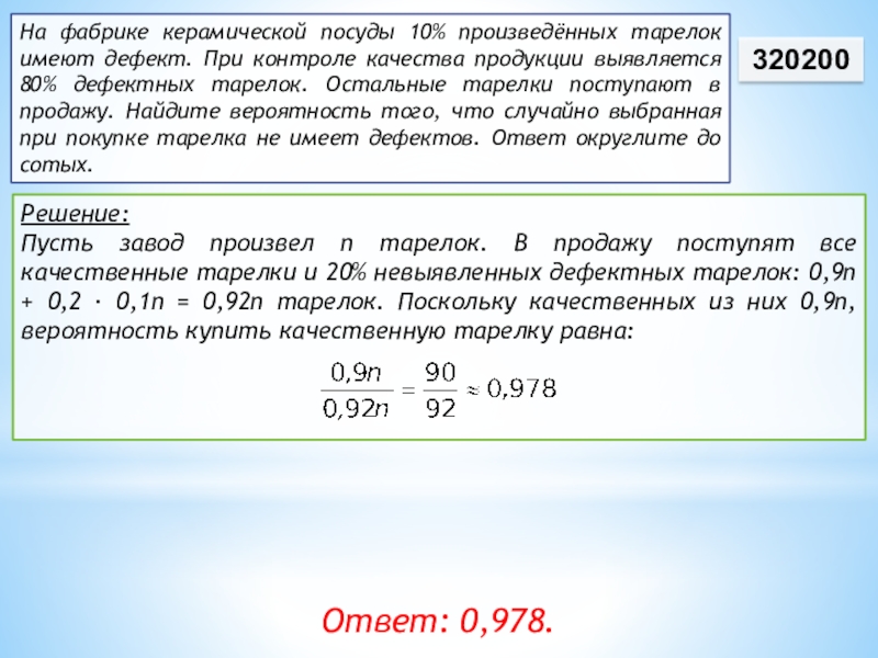 На фабрике керамической посуды 10% произведённых тарелок имеют дефект. При контроле качества продукции выявляется 80% дефектных тарелок. Остальные тарелки поступают в продажу. Найдите вероятность того, что случайно выбранная при покупке тарелка не имеет дефектов. Ответ округлите до сотых.