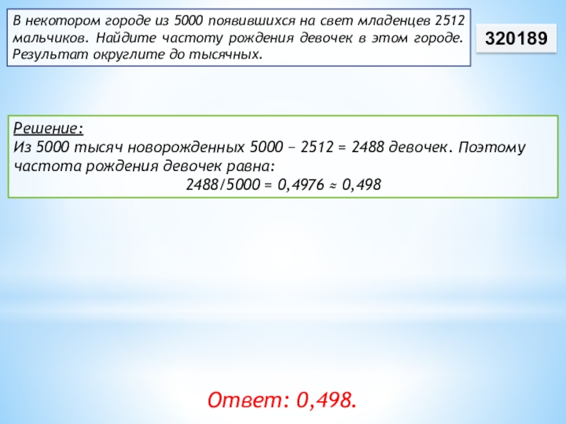 В некотором городе из 5000 появившихся на свет младенцев 2512 мальчиков. Найдите частоту рождения девочек в этом городе. Результат округлите до тысячных.