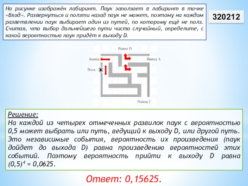 На рисунке изображён лабиринт. Паук заползает в лабиринт в точке «Вход». Развернуться и ползти назад паук не может, поэтому на каждом разветвлении паук выбирает один из путей, по которому ещё не полз. Считая, что выбор дальнейшего пути чисто случайный, определите, с какой вероятностью паук придёт к выходу D.
