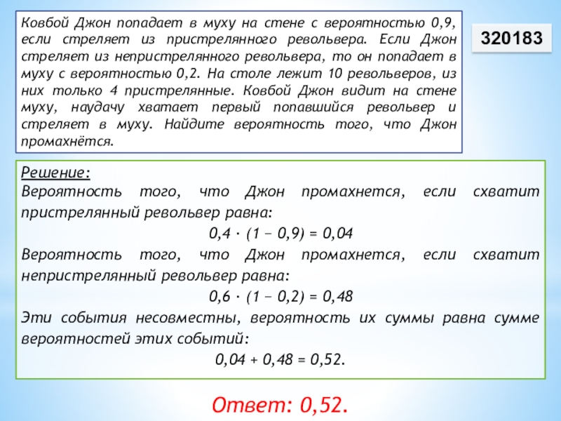 Ковбой Джон попадает в муху на стене с вероятностью 0,9, если стреляет из пристрелянного револьвера. Если Джон стреляет из непристрелянного револьвера, то он попадает в муху с вероятностью 0,2. На столе лежит 10 револьверов, из них только 4 пристрелянные. Ковбой Джон видит на стене муху, наудачу хватает первый попавшийся револьвер и стреляет в муху. Найдите вероятность того, что Джон промахнётся.