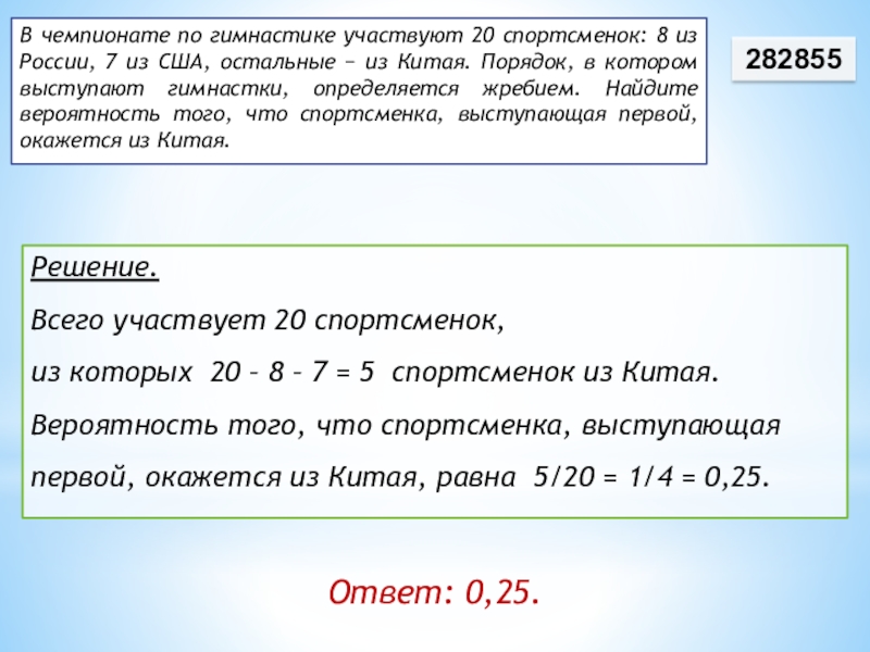 Вероятность того, что спортсменка, выступающая первой, окажется из Китая, равна 5/20 = 1/4 = 0,25.