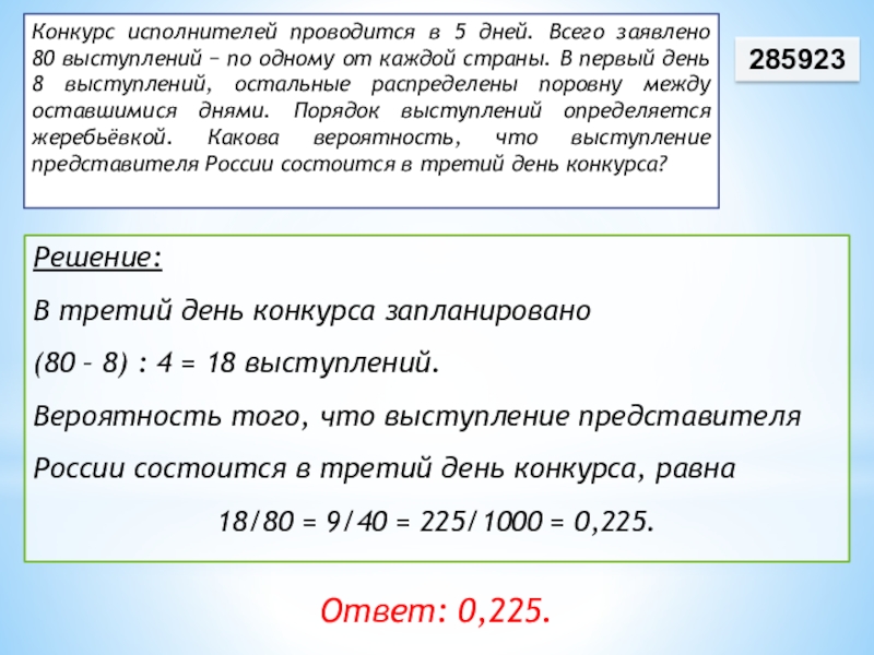 Вероятность того, что выступление представителя России состоится в третий день конкурса, равна