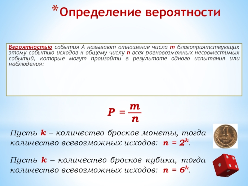 Пусть k – количество бросков кубика, тогда количество всевозможных исходов: n = 6k.