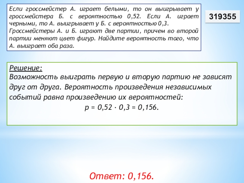 Возможность выиграть первую и вторую партию не зависят друг от друга. Вероятность произведения независимых событий равна произведению их вероятностей: