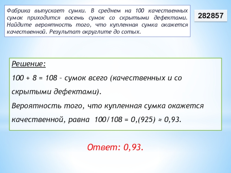 Фабрика выпускает сумки. В среднем на 100 качественных сумок приходится восемь сумок со скрытыми дефектами. Найдите вероятность того, что купленная сумка окажется качественной. Результат округлите до сотых.
