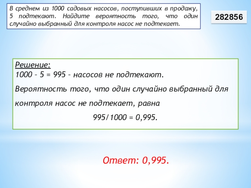 Вероятность того, что один случайно выбранный для контроля насос не подтекает, равна