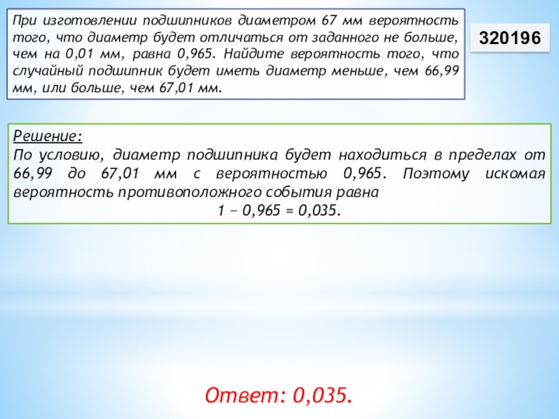 При изготовлении подшипников диаметром 67 мм вероятность того, что диаметр будет отличаться от заданного не больше, чем на 0,01 мм, равна 0,965. Найдите вероятность того, что случайный подшипник будет иметь диаметр меньше, чем 66,99 мм, или больше, чем 67,01 мм.