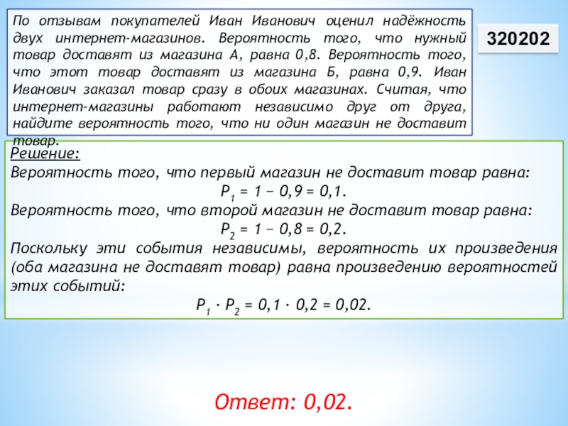 По отзывам покупателей Иван Иванович оценил надёжность двух интернет-магазинов. Вероятность того, что нужный товар доставят из магазина А, равна 0,8. Вероятность того, что этот товар доставят из магазина Б, равна 0,9. Иван Иванович заказал товар сразу в обоих магазинах. Считая, что интернет-магазины работают независимо друг от друга, найдите вероятность того, что ни один магазин не доставит товар.