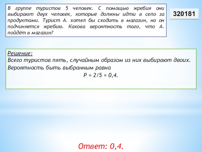 В группе туристов 5 человек. С помощью жребия они выбирают двух человек, которые должны идти в село за продуктами. Турист А. хотел бы сходить в магазин, но он подчиняется жребию. Какова вероятность того, что А. пойдёт в магазин?