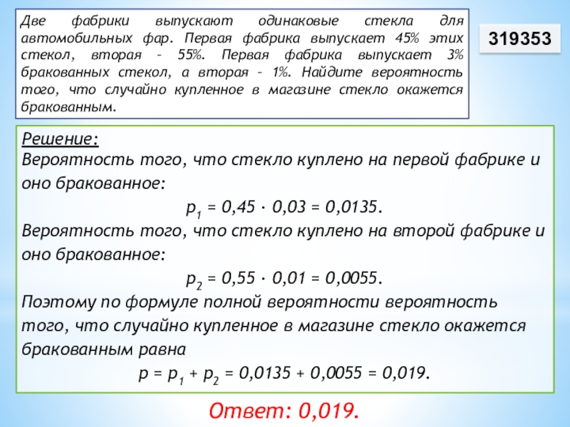 Поэтому по формуле полной вероятности вероятность того, что случайно купленное в магазине стекло окажется бракованным равна