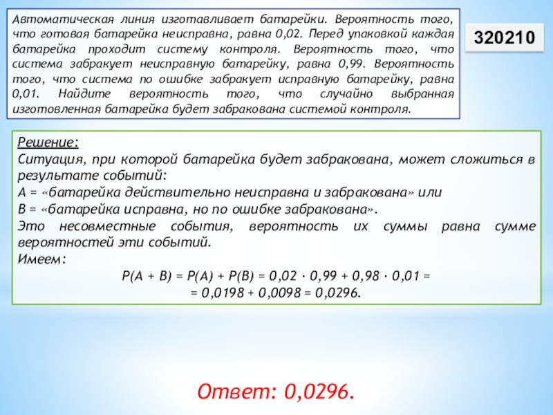 Автоматическая линия изготавливает батарейки. Вероятность того, что готовая батарейка неисправна, равна 0,02. Перед упаковкой каждая батарейка проходит систему контроля. Вероятность того, что система забракует неисправную батарейку, равна 0,99. Вероятность того, что система по ошибке забракует исправную батарейку, равна 0,01. Найдите вероятность того, что случайно выбранная изготовленная батарейка будет забракована системой контроля.