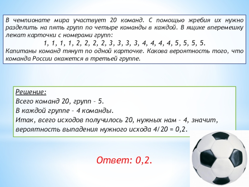 В чемпионате мира участвует 20 команд. С помощью жребия их нужно разделить на пять групп по четыре команды в каждой. В ящике вперемешку лежат карточки с номерами групп: