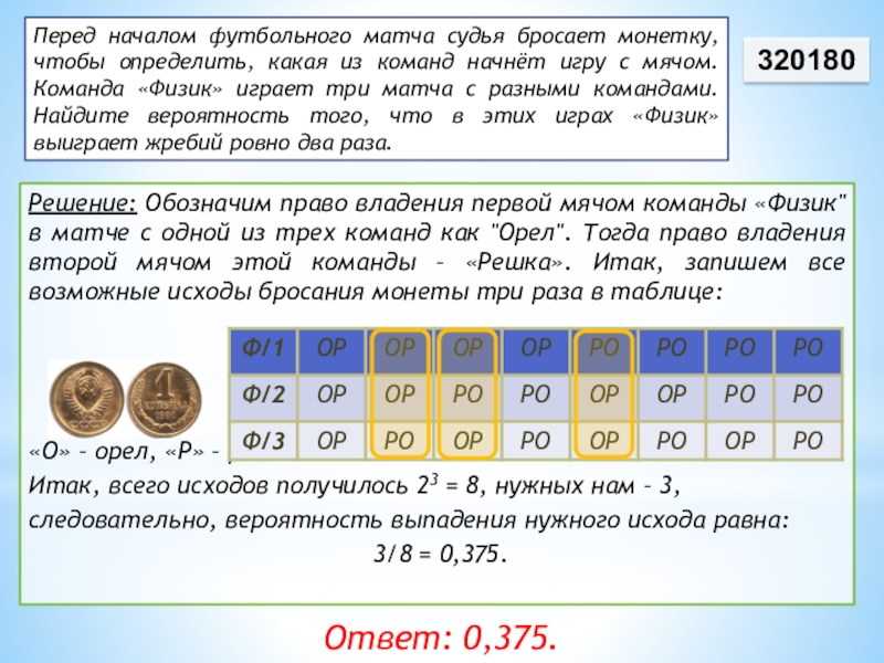 Перед началом футбольного матча судья бросает монетку, чтобы определить, какая из команд начнёт игру с мячом. Команда «Физик» играет три матча с разными командами. Найдите вероятность того, что в этих играх «Физик» выиграет жребий ровно два раза.