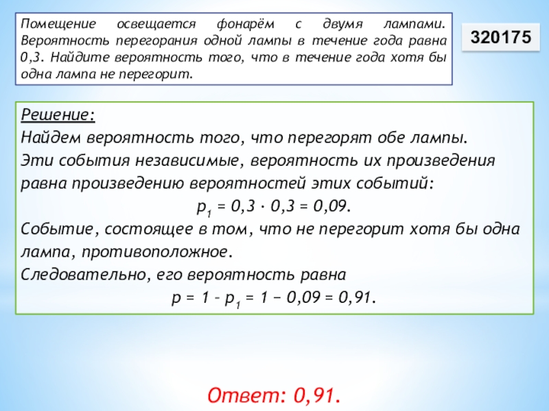 Помещение освещается фонарём с двумя лампами. Вероятность перегорания одной лампы в течение года равна 0,3. Найдите вероятность того, что в течение года хотя бы одна лампа не перегорит.