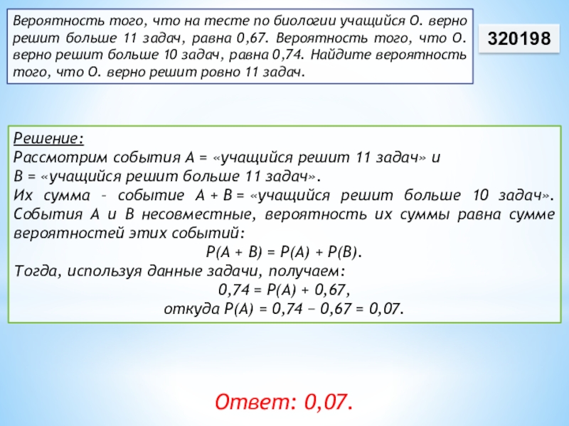 Вероятность того, что на тесте по биологии учащийся О. верно решит больше 11 задач, равна 0,67. Вероятность того, что О. верно решит больше 10 задач, равна 0,74. Найдите вероятность того, что О. верно решит ровно 11 задач.
